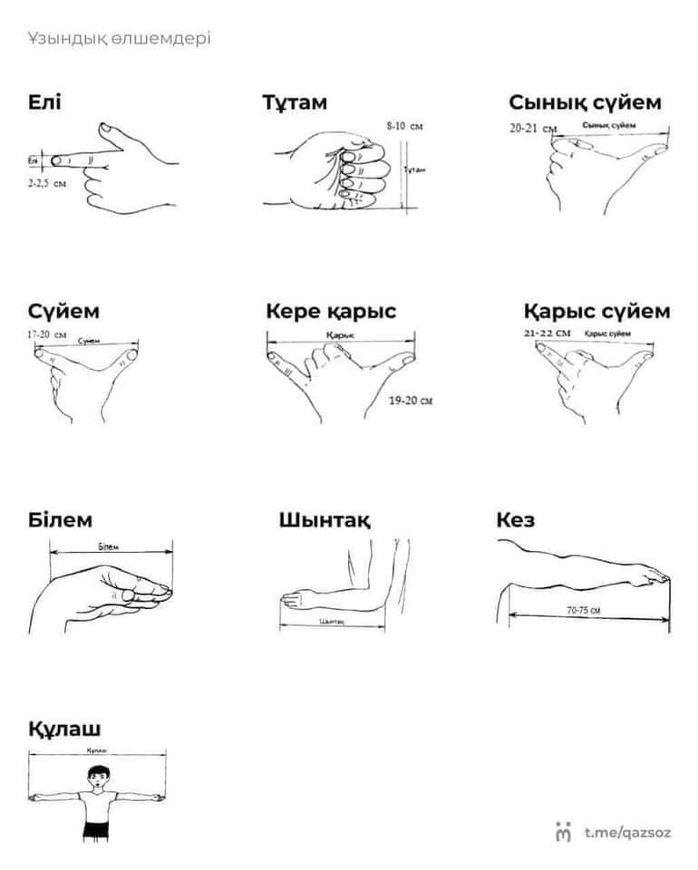 • Кез — саусақтардың ұшынан иыққа дейінгі қашықтық (~70-80 см);