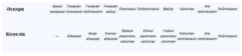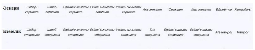Әскери саладағы офицерлік құрамның реті: лейтенант, аға лейтенант, капитан, майор, подполковник, полковник, генерал-майор, генерал-лейтенант, генерал-полковник және Армия генералы.
