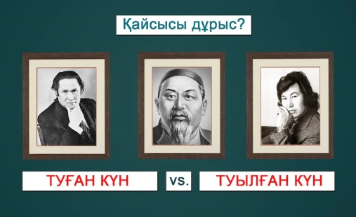 Сондықтан қазақтың сөзін дұрыс жазу қажет. Хәкім Абайдың өзі де: "Туғанда дүние есгін ашады өлең, Өлеңмен жер қойнына кірер денең" немесе Мұқағалиды алайық: "Бүгін менің туған күнім ой, пәлі-ай, Мына адамдар неге жатыр тойламай?!". Осылардағы "туған" сөзін байқауға болады, - дейді тіл жанашыры.