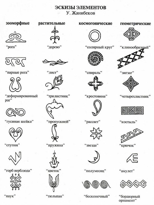 У разных элементов орнамента были свои функции: одни вырезали на деревянных изделиях, другие нашивали на одежду, расписывали посуду. Узоры жапырак – листья, уш жапырак – трилистники, гуль – цветок вышивали гладью, ими украшали одежду и головные уборы. Узоры агаш – древо встречаются в оформлении мавзолеев. Вообще этот элемент восходит к мифу о мировом дереве, который есть почти у всех народов. Такое дерево, по тюркским преданиям, росло на самой высокой горе Алтая. Оно называлось Байтерек. Дерево с сидящими на нём птицами мы видим и на шапке Золотого человека. Так что этот элемент орнамента имеет отношение к государственной символике Республики Казахстан.