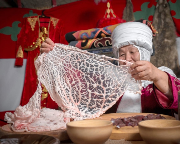 «У каждого блюда есть свой период. Например, блюдо, которое заготавливалось в желудке скота, идет еще с периода кочевников. Есть специальные блюда, предназначенные для мужчин, женщин, детей, гостей, невесток, зятя и так далее. В целом этот обряд называется «табақ тарту», мы насчитываем их 40. Это говорит о том, что хозяйства отдавали дань каждому. К примеру, один из обрядов «ақ қағал» - это встречать гостя с белым напитком, желая ему тем самым светлого будущего. Гостям, приехавшим издалека, преподносился өкпе сут: в легкие барана через гортань заливали молоко и варили. Это блюдо получается очень нежное, что говорит об отношении к гостям. Детей баловали телшик куырдаком, его приготовление не трудоемкое, но имеет свои особенности. Дело в том, что еще зимой мясо с конского ребра помещали в муку и оставляли до самой весны. И к Наурызу мясо доставали из муки, мелко нарезали, тушили. Мука, в которой оно находилось, тоже пригодна, она пропитывается и приобретает желтый цвет. Тесто из нее варят. Последнее блюдо называется үзбен тайлақ», - рассказывает собеседница.
