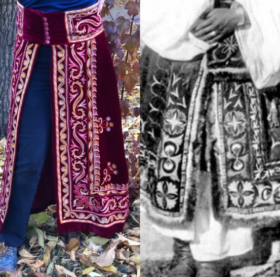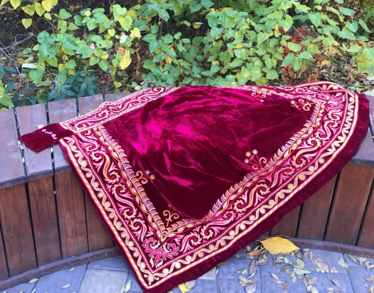 И она придумала простой и гениальный способ (или первый шаг на пути?) возрождения старинной казахской юбки: заказала ее для себя у замечательных народных мастериц – вышивальщицы Кулжай Кусман и портнихи и войлочницы Ауэс Сагинаевой. В качестве «прототипа» была выбрана белдемше из Южно-Казахстанского музея: ее фасон, ее орнамент, только цвет ткани было решено поменять на насыщенный бордовый.